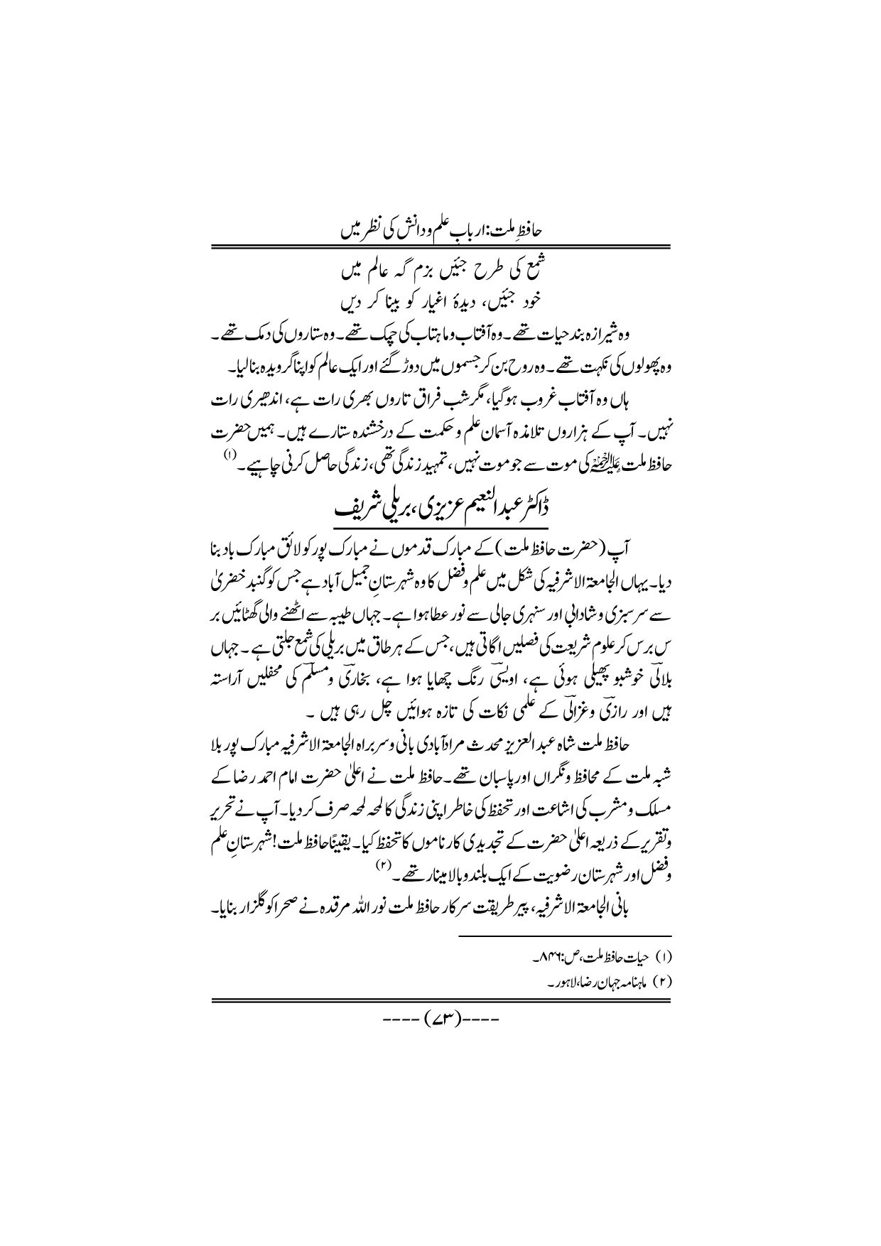 Hafiz-e-Millat Arbabe elmo danish ki nazar me